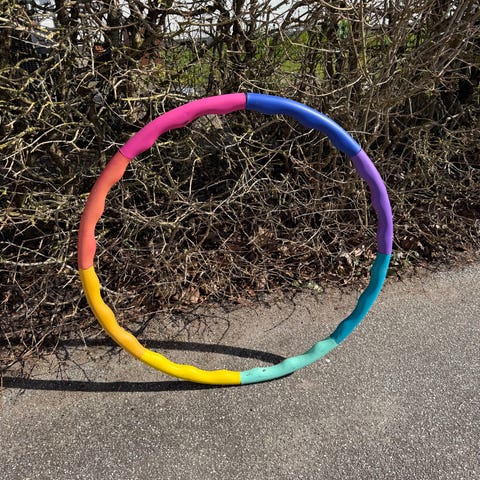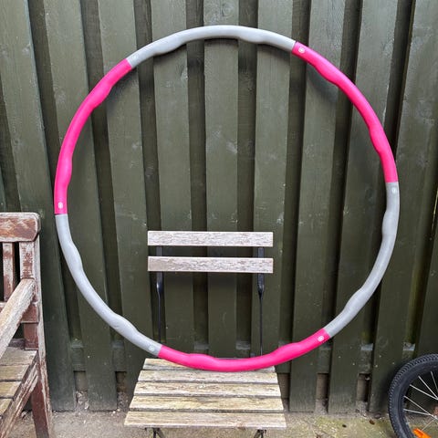 Hulahopring i plast i farverne pink og grå. Ringen består af sektioner, der samles til en cirkel. Velegnet til træning, leg og motion for både børn og voksne, afhængigt af størrelse og brugerens behov. Perfekt stand. Kan sendes mod at køber betaler portoen.