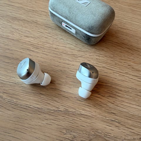 Sælger disse lækre Sennheiser Momentum True Wireless 4 ørepropper i et smukt og stilfuldt design med et stofbetrukket opladningsetui.