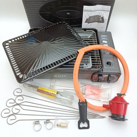 Gasgrill med tilhørende gasregulator og gasslange med messingkoblinger. Grillen har rundt grillareal med metalrist og understel i metal. Regulatoren monteres på gasflaske og forbindes til grillen via slangen. Egnet til udendørs madlavning på terrasse eller altan, hvor der anvendes gas som brændsel.