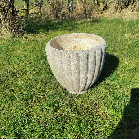 Stor riflet havekrukke i sandsten i hvidlig/grålig farve med patina. Krukken har rund form med bølget kant og lodrette riller hele vejen rundt. Velegnet som plantekrukke til haven, terrasse eller indkørsel. Åbningen og højden fremgår af billederne med tommestok for ca. mål. Krukken har drænhul i bunden (hvis synligt) og er egnet til udendørs brug året rundt.