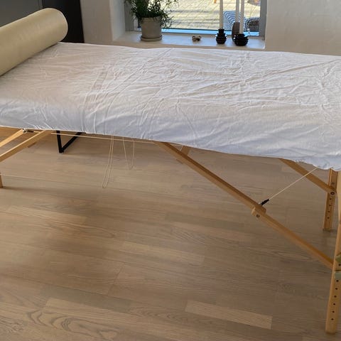 Brugt meget lidt, bæretasken har smittet lidt af på det lyse, se billeder, ikke noget der har betydning, da man jo har lagen over. Jeg har tilkøbt armstøtte, blødt betræk til hovedstøtte samt en hel pakke med engangs "betræk" til hovedstøtte. Det følger med i prisen, samt en bæretaske til det hele.