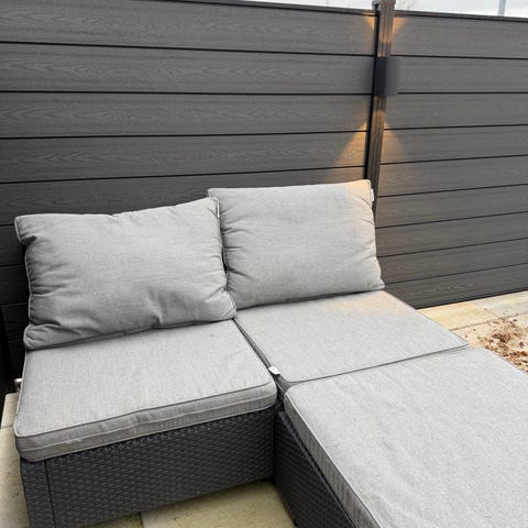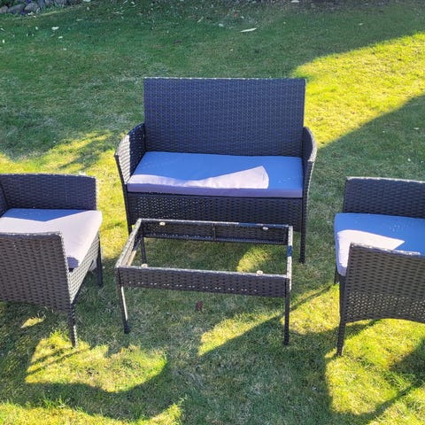 Lounge møbler i grå poly rattan. Flettet er gået op et par steder, ellers er det i ok stand.