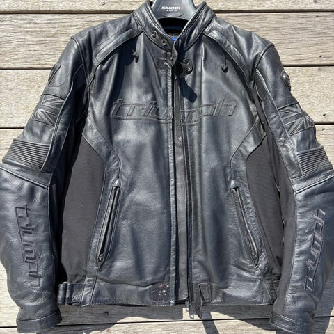 Triumph motorcykeljakke og bukser i sort tekstil. Kørt ca 1000 km Sættet består af jakke med lynlåslommer, justerbare stropper ved ærmer og talje samt aftageligt for. Bukserne har bælte og flere lommer. Nypris 7500 og er super godt sæt. Jeg har bare skiftet til Ducati og derfor kan bytte til andet tøj være en mulighed.