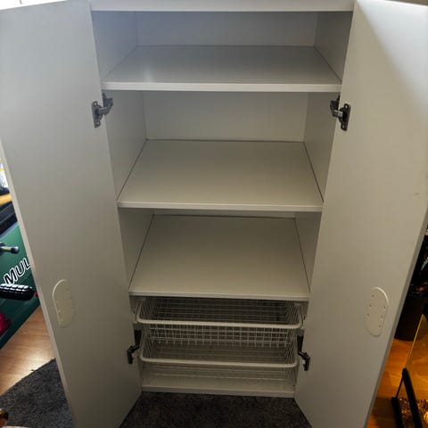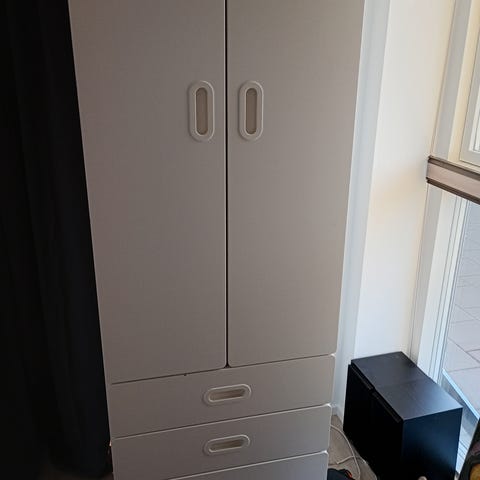Super fint garderobeskab til børneværelset. Fejler intet, til overs efter flytning. Bøjlestang og hylder nederst.