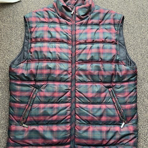 Tommy Hilfiger dunvest, vendbar, herre, str. L til XL. Farve blå/ rød, materiale polyester, lynlås og lommer med trykknap lukning lommer. Brugt få x, nærmest som ny.