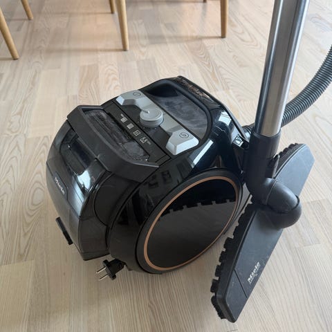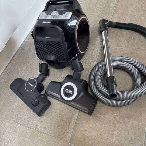 Miele Boost CX1 støvsuger med pose i grå/hvide nuancer. Kompakt model med regulerbar sugestyrke via drejeknap på toppen. Støvsugeren har aftagelig støvbeholder/filtersystem, bærehåndtag og tilsluttet sugeslange. Velegnet til almindelig rengøring af gulve og tæpper i hjemmet. Flere standard- og specialmundstykker kan typisk tilkobles (afhænger af medfølgende udstyr).
