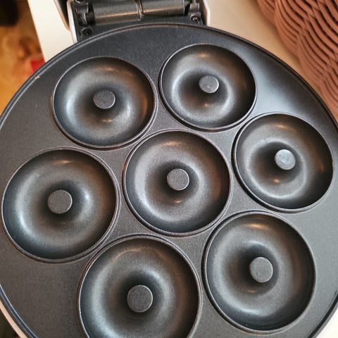Apparat til at lave mini doughnuts. Virkelig sjov aktivitet. Nogenlude samme størrelse som et vaffeljern. Alt virker som det skal.