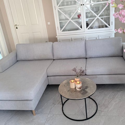 Smukkeste lys grå chaiselong sofa i blødt og slidstærkt kvalitets stof. Betræk på puder og hynder kan aftages og vaskes i maskine.