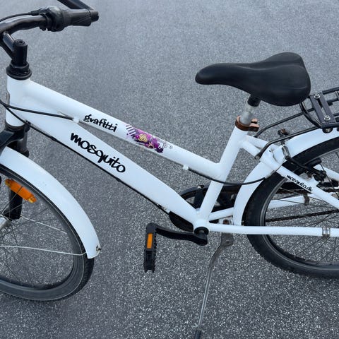 Den har en lille bule i bagskærm, og lidt spor fra vind og vejr ved cykelstyr (se fotos), men ellers i rigtig fin stand.