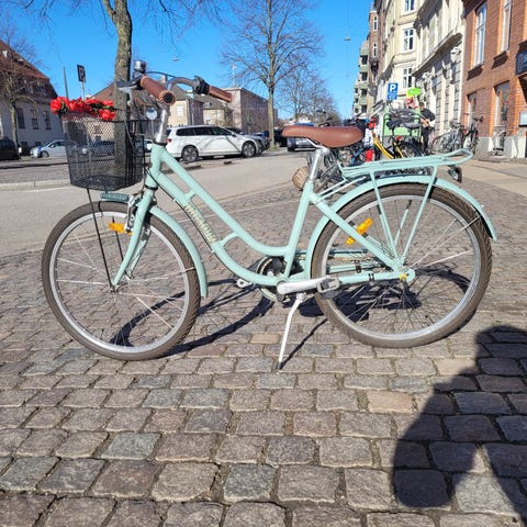 Rigtig flot turkisfarvet Ortler Bricktown pigecykel, hjulstørrelse 24" og cremefarvede dæk og dejligt bredt cykelsæde.