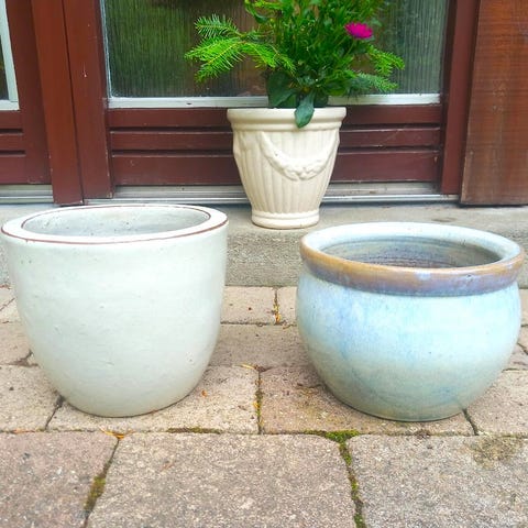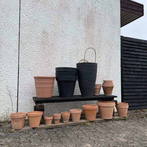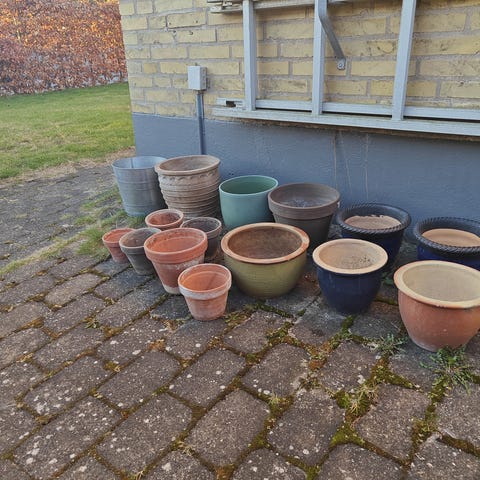 Sæt med forskellige havekrukker / plantekrukker i flere størrelser. Blandede materialer, herunder terracotta og glaseret keramik. Farverne omfatter blandt andet grå, sort, blå og natur/terracotta. Krukkerne egner sig til udplantning af blomster, krydderurter eller mindre buske på terrasse, altan eller i haven. En af de største krukker måler ca. 40 cm i højde og ca. 40 cm i diameter, som vist på billederne. Sælges samlet som på billederne.