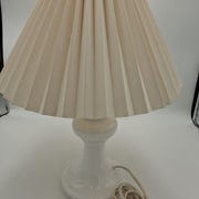 Rund bordlampe i glas med en glat, hvid overflade og blålige mønstre samt en plisseret skærm i lys farve. -- Bemærk at mail, chat og beskeder ikke besvares, og varen skal købes på knappen "Gå til varen". Efter reservering af varen har du 10 dage til at afhente den i den butik, varen er på lager i.