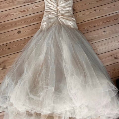 Brudekjole med skulpturel off-shoulder top og lagdelte volanger i let tyl, perfekt til den store dag.- Bemærk at mail, chat og beskeder ikke besvares, og varen skal købes på knappen "Gå til varen". Efter reservering af varen har du 10 dage til at afhente den i den butik, varen er på lager i.