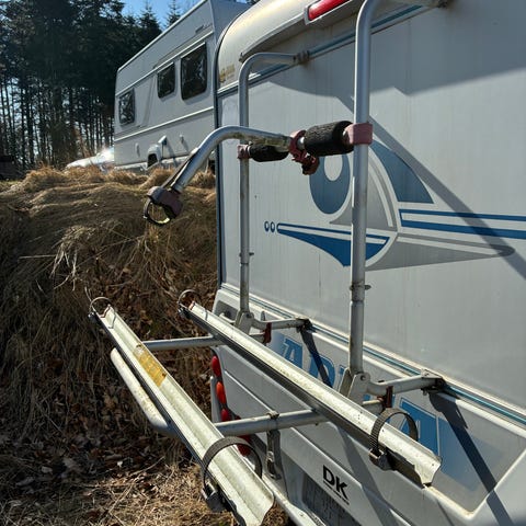 Cykelholder til campingvogn, bagmonteret model i metal. Monteres på bagenden af campingvognen og er konstrueret til transport af cykler. Holderen består af en fast ramme med beslag til montering samt skinner til placering af cykler. Egnet til brug på campingvogne med passende monteringsmuligheder på bagvæggen.