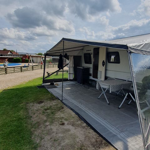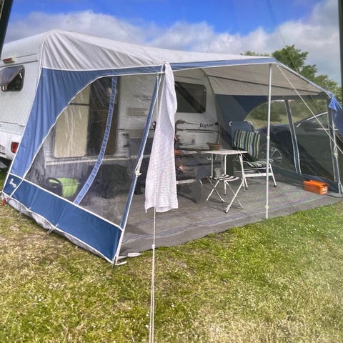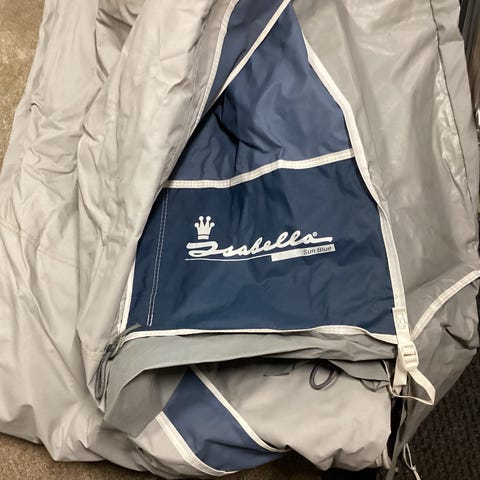 grå/blå farver. Solsejlet har store klare vinduespartier i siderne som giver godt lysindfald. Medfølger 2 koste.