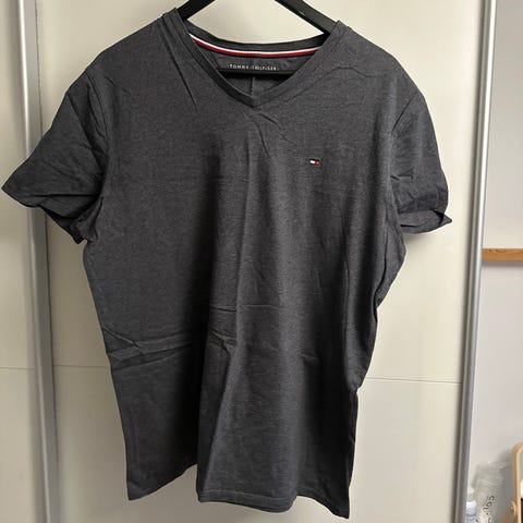 Tommy Hilfiger T-shirt til herre i størrelse L. T-shirten er sort og fremstillet i bomuld. Modellen har V-hals og kortærmer. Lille Tommy Hilfiger-logo på brystet. Velegnet som hverdags-T-shirt eller under en trøje eller jakke.