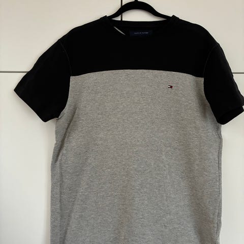 Tommy Hilfiger T-shirt til herre i størrelse L. T-shirten er grå og fremstillet i bomuld. Den har V-hals og kortærmet design. Diskret Tommy Hilfiger-logo på brystet. Velegnet til hverdagsbrug eller som basisdel i garderoben.