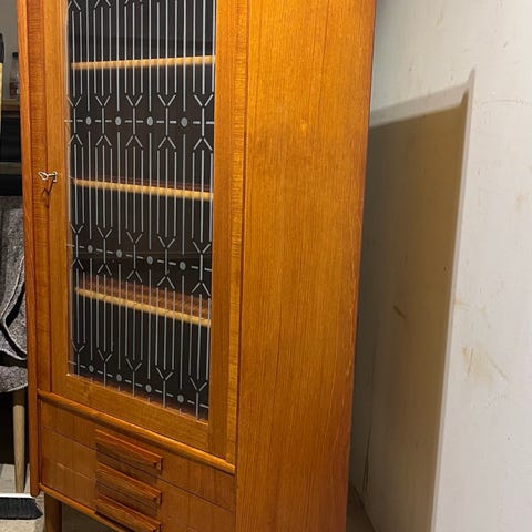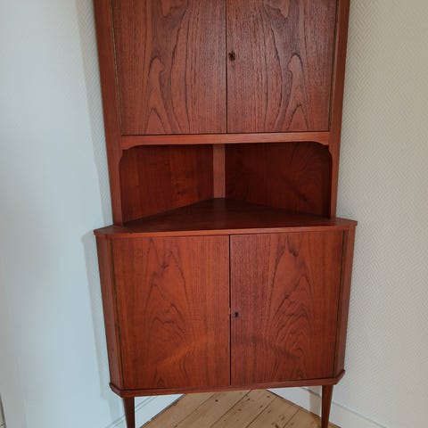 Retro hjørneskab i teak med blyindfattet buet glas i lågen, i rigtig fin stand med meget få brugsspor.