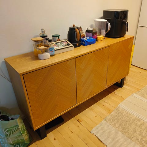 Smuk og meget velholdt skænk i formpresset bøg sælges. Skænken rummer 3 store skuffer og 3 skabe med hylder. Meget anvendeligt møbel, som fremstår som nyt.