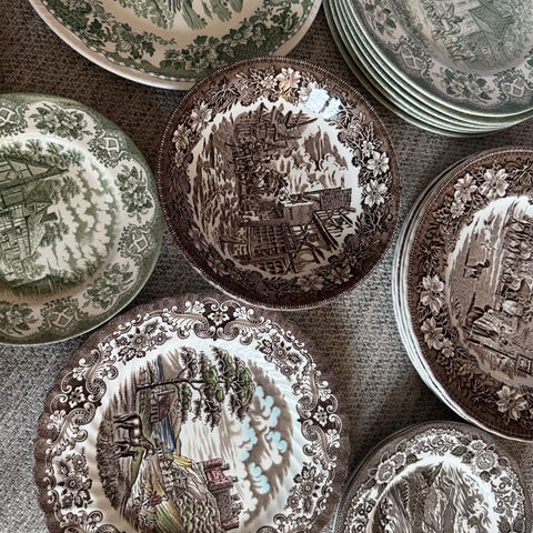 Engelsk fajance porcelæn sort, en sort med farver og en grøn. Har også rød :)