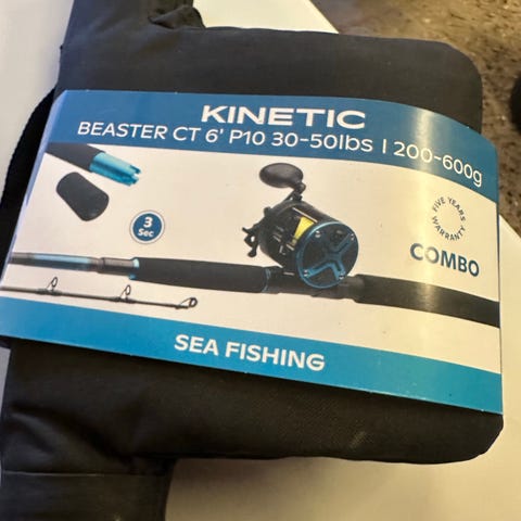 Seven havfiskestang med hjul i sort udførelse. Stangen er todelt med skumhåndtag og metaløjer, herunder et rulleøje i spidsen. Der medfølger et fiskehjul monteret på stangen samt en sort stofpose med Seven-logo til opbevaring. På billederne ses desuden plastkasser og en taske, som kan anvendes til opbevaring af grej. Velegnet til hav- og kystfiskeri, hvor der ønskes en kraftigere stang til større fisk.