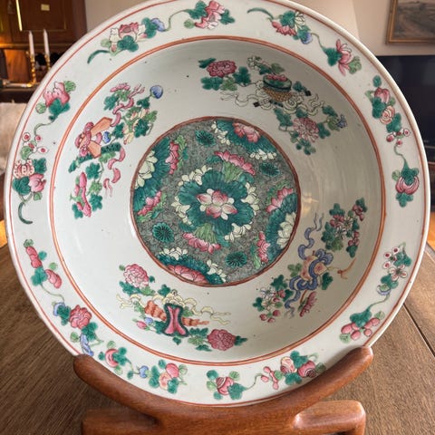Dekor: Famille-rose palet med figurscener, blomster og ornamentik
