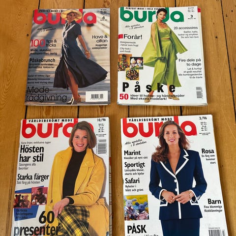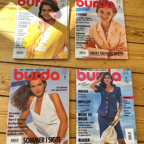 Samlet pris. 4 stk. syblade fra 90’erne.. Der medfølger mønsterark til alle blade. Du kan købe med “køb nu”, komme og hente varen tæt ved Nørrebros Runddel eller betale mig for varen og forsendelse (40 kr.) på MobilePay