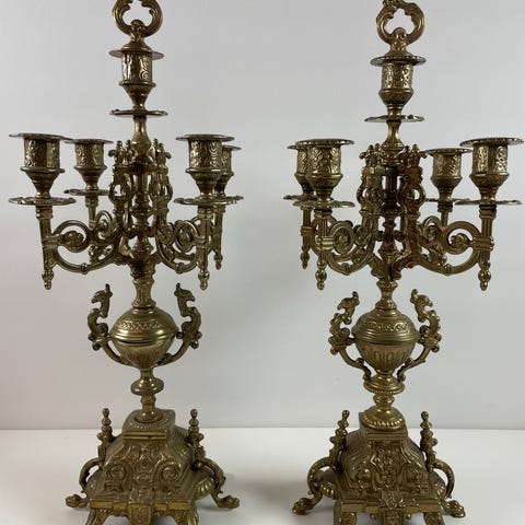 2 stk. Messing kandelabre med 3 arme. Klassisk design med rund fod og dekorativt løvemønster under lysestagerne. Mål; H 42 cm. uden lys. Diametet fod 20 cm.