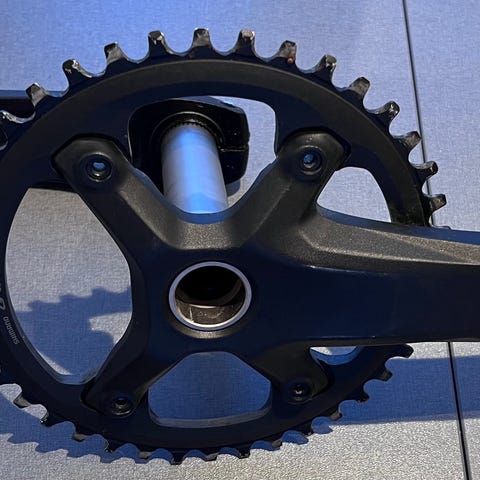 Shimano krank til cykel med monteret klinge. Krankarmen er i sort og leveres med aksel og klinge som vist på billederne. Velegnet som reservedel eller opgradering på cykler, der bruger Shimano GRX
