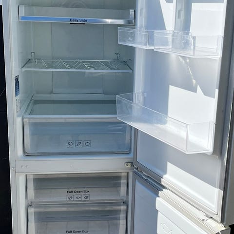 Ældre Samsung køleskab i stål. Virker som det skal. Brugt under køkken renovering.