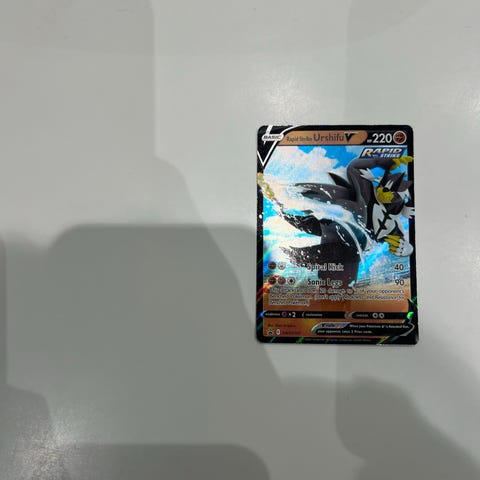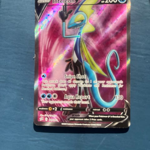 Pokémon Inteleon Rapid Strike samlekort. Kortet viser vand-type Pokémonen Inteleon med 150 HP. Angrebene inkluderer Quick Shooting og Waterfall. Standard Pokémon TCG kortstørrelse med illustreret forside og klassisk blå bagside med Poké Ball motiv. Velegnet til samling eller spil i Pokémon Trading Card Game.