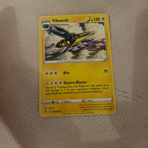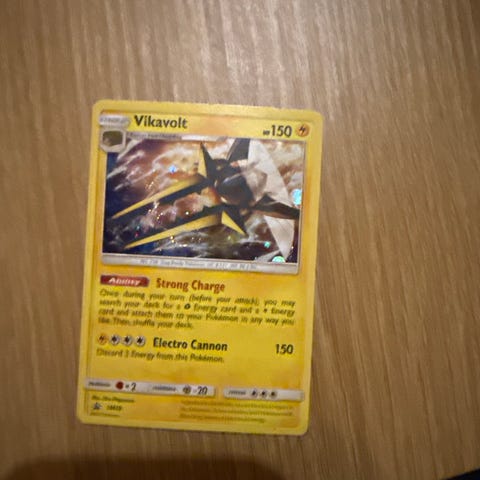 Pokémon Vikavolt kort. Samlekort fra Pokémon Trading Card Game med motiv af Pokémonen Vikavolt. Kortet viser angrebene Strong Charge og Electro Cannon samt kortets livspoint og øvrige spilinformation på forsiden. Bagsiden er standard blå Pokémon TCG bagside med Poké Ball-design. Velegnet til samling eller brug i Pokémon-kampe.