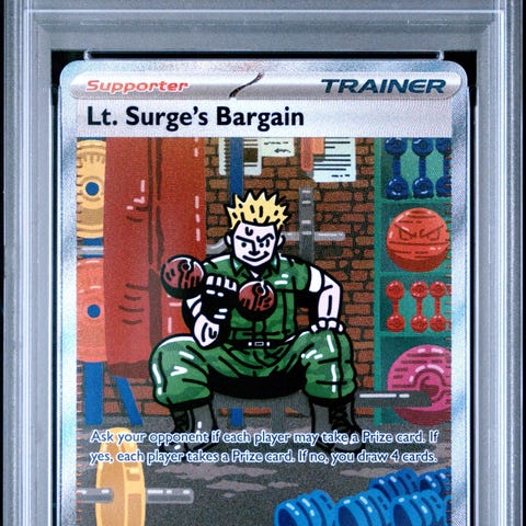 Pokémon Lt. Surge’s Treaty Trainerkort fra sættet Gym Heroes, årgang 2000. Kortet er indkapslet og graderet af PSA med karakteren Mint 9. Standard Pokémon-kortstørrelse, med motiv af træneren Lt. Surge. Velegnet til samlere af Pokémon-kort og særligt til dem, der fokuserer på ældre sæt og PSA-graderede kort.