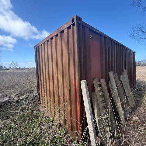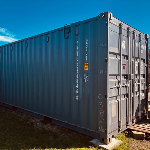 Container i stål med side- og baglåger. 30kbm Velegnet til opbevaring eller affaldshåndtering. Containeren har flere låger i siden for nem adgang til indholdet samt baglåge. Overfladen fremstår i gråmalet stål. Ønskes den som åben affaldscontainer kan vi for 2000 skære låget af og slibe kanten