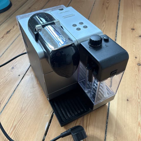 Nespresso DeLonghi kapsel kaffemaskine med integreret mælkeskummer i hvid. Kan lave espresso/Lungo eller et par mælkevarianter. Der medfølger 140 stk Nespresso Lungo kapsler. Sælger den da vi har fået en ny større maskine. Fungerer helt upåklageligt.