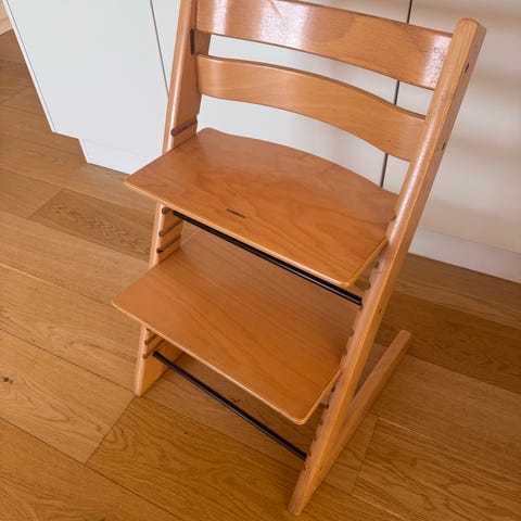 Stokke Tripp Trapp højstol i lyst træ. Klassisk justerbar højstol med flytbar siddeplade og fodplade, der kan tilpasses barnets højde.
