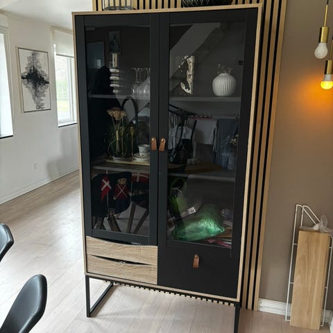 Pæn og meget velholdt Tulino Vitrineskab med 2 glaslåger og 3 skuffer. Den er købt i Ilva Holstebro. Højde 188,5 cm, bredden er 98,5 cm, dybden er 40 cm.
