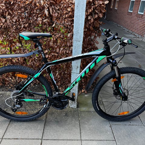 Scott mountainbike til mænd med stelstørrelse M og 27.5" hjul. Cyklen har affjedret forgaffel, brede dæk med groft mønster og fladt styr, som egner sig til kørsel på både grus og skovstier. Udstyret med skivebremser og standard sadel til herre. Velegnet som hverdagscykel og til fritidsbrug i terræn.
