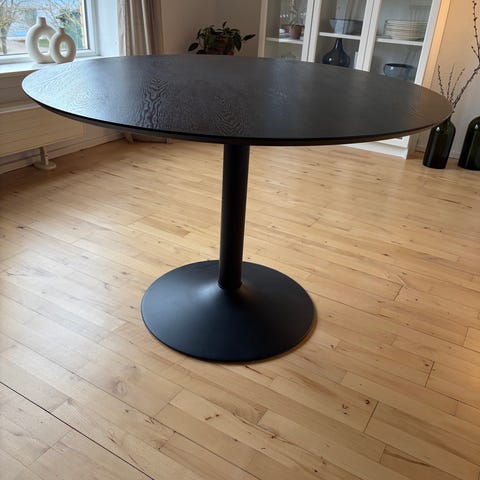 Flot rundt sort spisebord diameter 120 cm og 76 cm i højde. Der medfølger en flot Sødahl dug. Der er altid brugt dug på bordet. Der er et lille sted på et af benene se billede. Bordet er købt i My Home Møbler.
