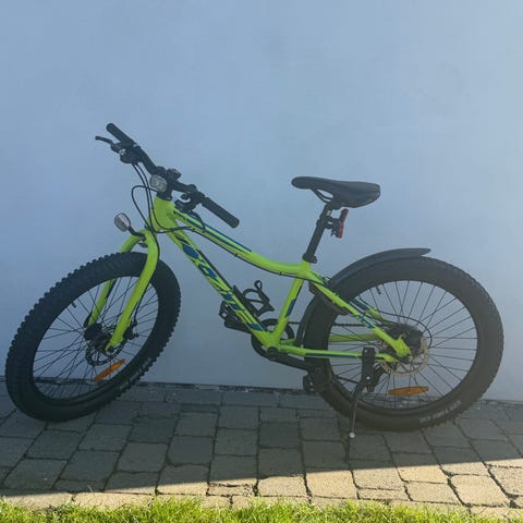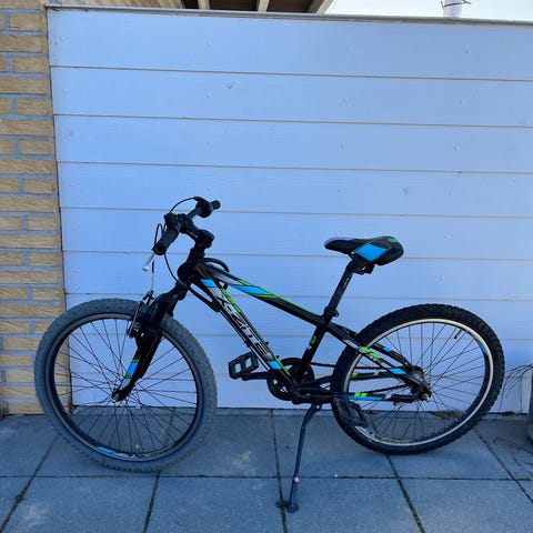 X-Zite børnecykel med 24" hjul. Cyklen er i blå farve med grønne og lyse detaljer. Udstyret med støtteben, for- og bagbremse på styret samt sadel og styr, der kan justeres i højde. Velegnet til større børn, der passer til 24" hjulstørrelse.