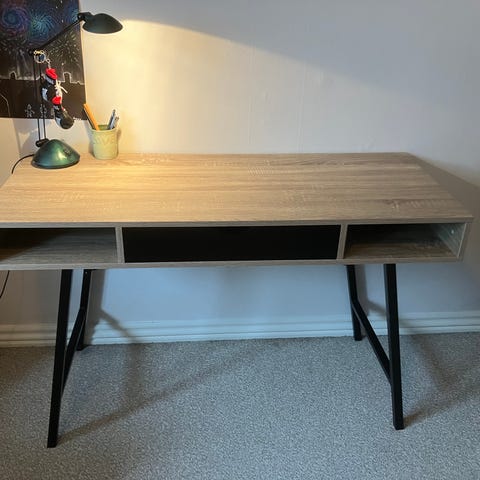 Jysk skrivebord. Bordet har bordplade i trælook med synlig årestruktur og sort metalstel. Under bordpladen er der et åbent rum til opbevaring samt en skuffe i sort front. Skrivebordet egner sig til brug som arbejdsbord eller studieplads i hjemmekontor, stue eller værelse.
