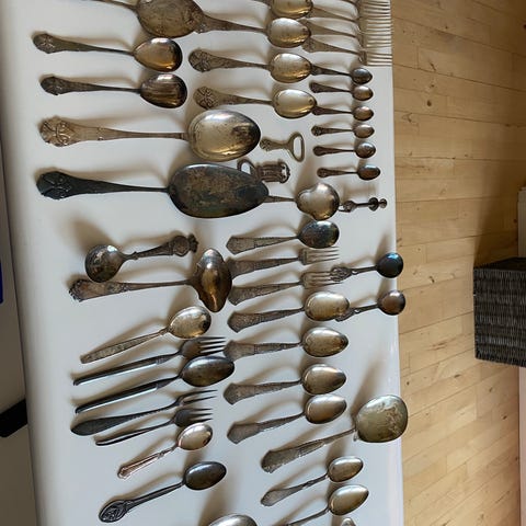 Diverse serveringsdele i bestik, herunder flere skeer, en sovseske, en lille gaffel, og kagespader. Bestikket er sølvfarvet og fremstår i metal. Velegnet til servering af mad, f.eks. sovs, salat, kage eller forretter. Flere forskellige mønstre og størrelser i samme lot. Mærkninger og stempler kan ses på nogle af delene på skaftet.