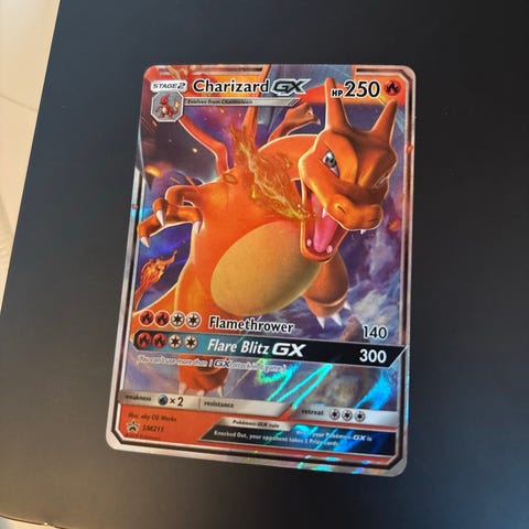 Pokémon Lycanroc GX samlekort med holografisk overflade. Kortet viser Lycanroc GX med 260 HP og angreb som blandt andet Crunch og Stone Fangs. Standard Pokémon Trading Card Game størrelse, egnet til samling eller spil i Pokémon TCG.