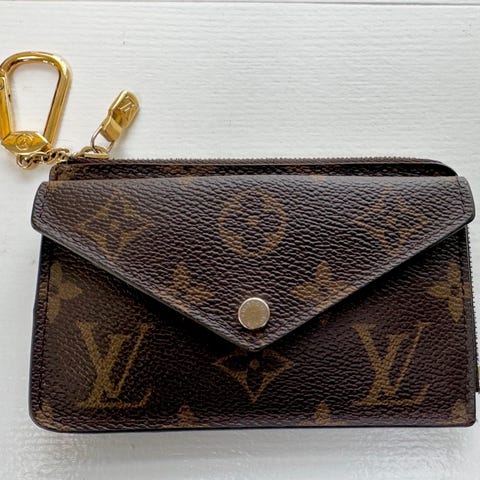 Louis Vuitton kortholder. Pungen har et monogrammønstret ydre i brune nuancer og lynlåslukning langs kanten.