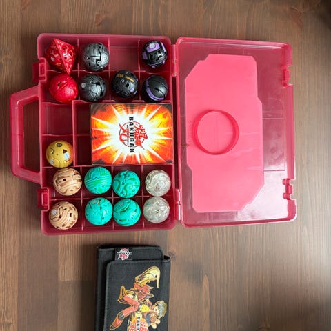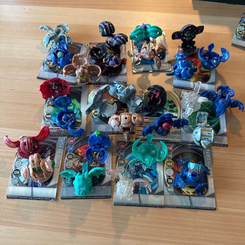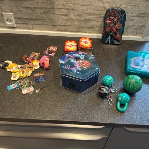 Bakugan samling bestående af flere Bakugan figurer og tilbehør samt tilhørende kort. Sættet opbevares i plastkasser med ruminddeling, som gør det nemt at holde figurer og kort adskilt og organiseret. Egnet til leg og samling for fans af Bakugan universet. Antal figurer og kort kan tælles ud fra billederne.Alle kan åbnes og lukkes