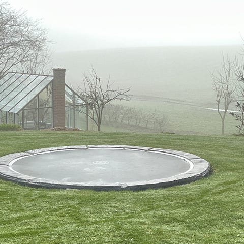 Trampolinen er til nedgravning i haven og har sort springdug med beskyttelseskant rundt om. .