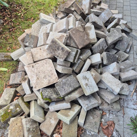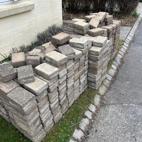 Vi har mellem 60 og 70 herregårdssten liggende, som kan afhentes gratis. Nogle få af stenene er skåret over på midten så der er nogle få halve sten i mellem.