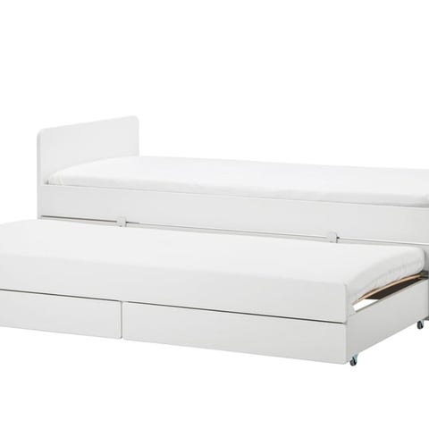 Flexa udtræksseng børneseng i hvidt træ med lamelbund. Sengen har udtræk, så den kan udvides til ekstra soveplads. Under sengen er der integrerede skuffer, som kan bruges til opbevaring af fx sengetøj eller legetøj. Velegnet som seng til børneværelset eller som kombineret sofa- og gæsteseng til børn.