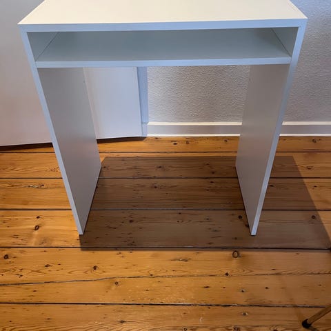 IKEA skrivebord til børn i hvid. Bordet har en rektangulær bordplade med hul til kabelgennemføring. Under bordpladen er der en skuffe i midten samt et skab med hylde i den ene side. Egnet som arbejds- eller legebord på børneværelset. Overfladen på bordpladen og indvendigt i skabet viser tydelige brugsspor og pletter, som fremgår af billederne.