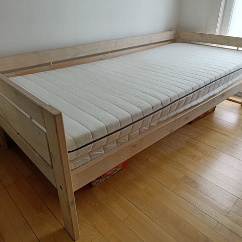 Hvidmalet fyrretræsseng, meget let at samle.2 gavle, 2 sider. Med lamelbund og evt gammel madras.85x200 cm.Vistnok Dunlopillo. Gavlhøjde 53 og 72 cm. Højde under bund ca 25 cm. Står skilt af, derfor ingen foto. Har været i brug for 2 mdr siden. Angivne mål er altså indvendige, passer til madras 85 x 200 cm
